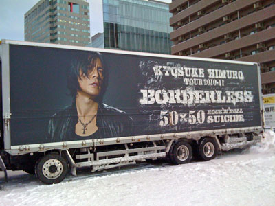 当日は、朝から雪が降り、寒い一日だった。雪で覆われた駐車場に停まっている数台のツアートラックも見た目は寒そうであったが、白い雪と対称的なトラック側面の黒色の引き締まったプリントを見ると、氷室氏の孤高さえ感じられ、気分はさらに高揚した。最高のステージをありがとう!また帰って来てください、盛岡へ!