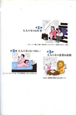 本の中味は、大きく3つの編に分かれていて「第1編 大人の女のお仕事」「第2編 大人の女のおつきあい」「第3編 大人の女の恋愛&結婚」という区分。「第1編 大人の女のお仕事」では、「お約束ギャグを使いこなせば、どんなオヤジ攻撃も怖くない!?」「各方面からの「女のクセに」という視線を華麗にはね返す方法」などなど。「第2編 大人の女のおつきあい」では、「エステや美容整形を話題にする時のセオリー」「お友達の結婚式では自分の感情をコントロールして楽しもう」などなど。「第3編 大人の女の恋愛&結婚」では、「どうでもいい男に誘われた時の当たり障りのない断り方」「結婚できないを結婚しないに変える理論武装のコツ」などなど。