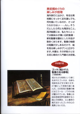 そのようにして聖書の教えが広まっていったのが絵の力によるところが大きいため、各時代の画家たちは聖書画を描いては、多くの名画を生み出してきた。時代の流れにそってしだいに識字率が上がり、徐々に聖書画の役割が変化していき、現代では、絵を「読む」から「視る」時代へと変わって行った…というような内容のことが、名画の紹介とともに解説されている。