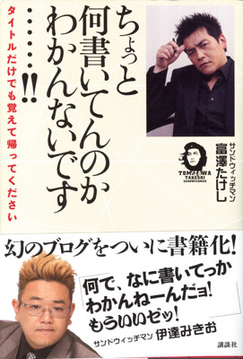 本のタイトルは、サンドウィッチマンのネタのボケの決め台詞である「ちょっと何言ってんのかわかんない…」を捩ったもの。ネタ作りをしているだけあって本に書いてある文章にも独自の言葉遣いのセンスがあり、且つ文章の構成もリズムがあって巧み。お笑い芸人らしく…と言っていいのか、下ネタが多く乱暴な言葉もあるが、それらは富澤さんの書く文章の計算のうち。子供の頃から雑誌に投稿して来たという富澤さんの物書きのセンスが味わえる一冊。