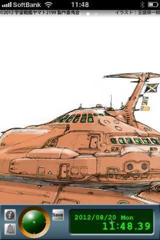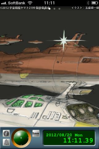 iPhone、iPod touch、iPad用のアプリケーション。壁紙は、全6種。お馴染みの夕日を浴びるヤマトの画の他デッサン画によるイメージ画像がほとんど。画面下部には日時と時刻がデジタル表示され、その横の丸いレーダー画面には大マゼラン銀河の方向が示され(iPhone3GS及びiPad2以上)、レーダーの周囲にある「i」アイコンをタップすると「2199」に関する最新情報を見ることが出来、「ベルの形」のアイコンをタップするとアラームの設定をすることができる。